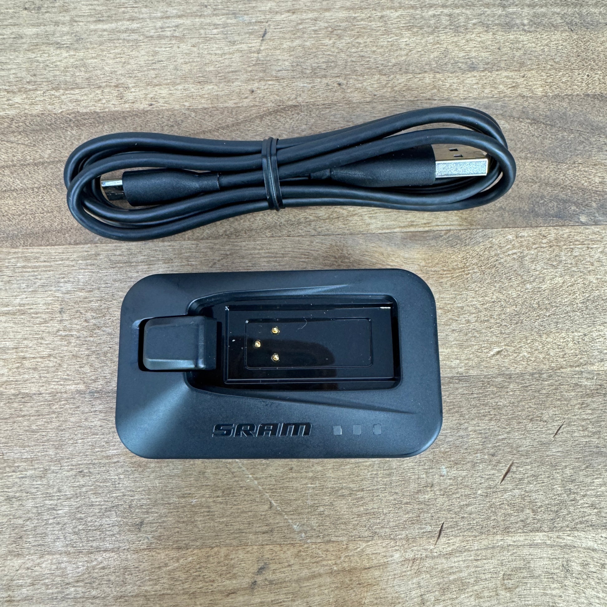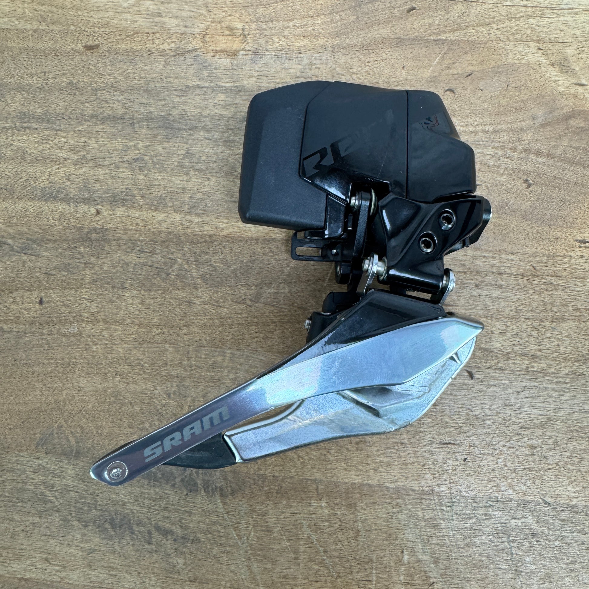 Front Derailleur: Sram Red AXS. The inside of the chain guide shows light wear from chain rub. No significant scratches or imperfections to point out. Battery and small chain wedge included.