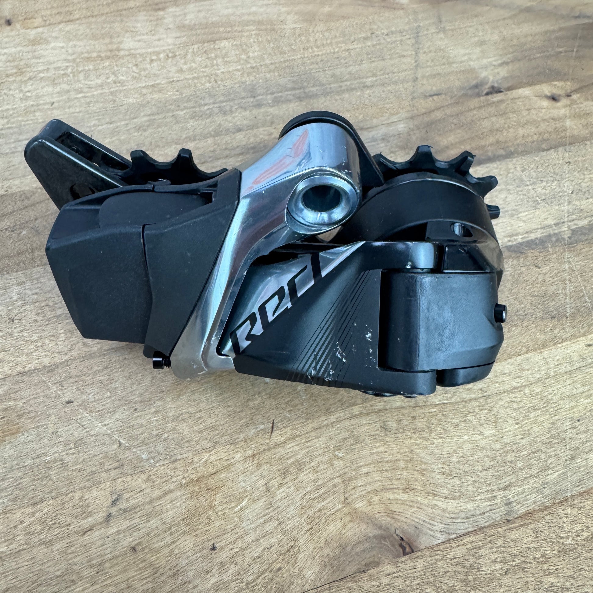 Rear Derailleur: Sram Red AXS. This derailleur is compatible with up to a 33t cassette. There are some light scratches on the outside edges of the derailleur. Pulley wheels show typical wear, and spin well.