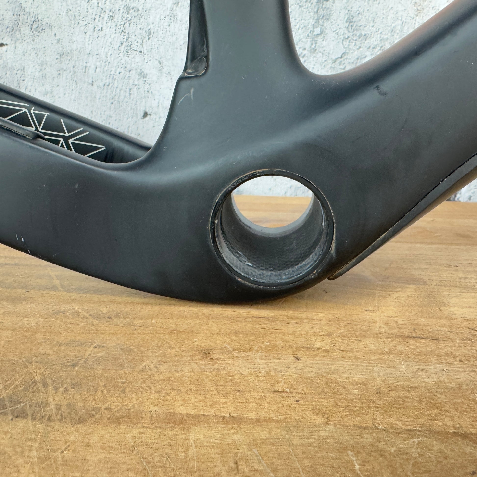Condition: No cracks or carbon defects were identified through a thorough visual inspection. The cosmetic imperfections to highlight include: Light scratches on the chainstay shown in pic #6. We have attempted to show all noticeable imperfections in specific close-up pictures, however other minor imperfections and light signs of use may exist. Per prior owner claims this frameset has less than 500 miles on it.