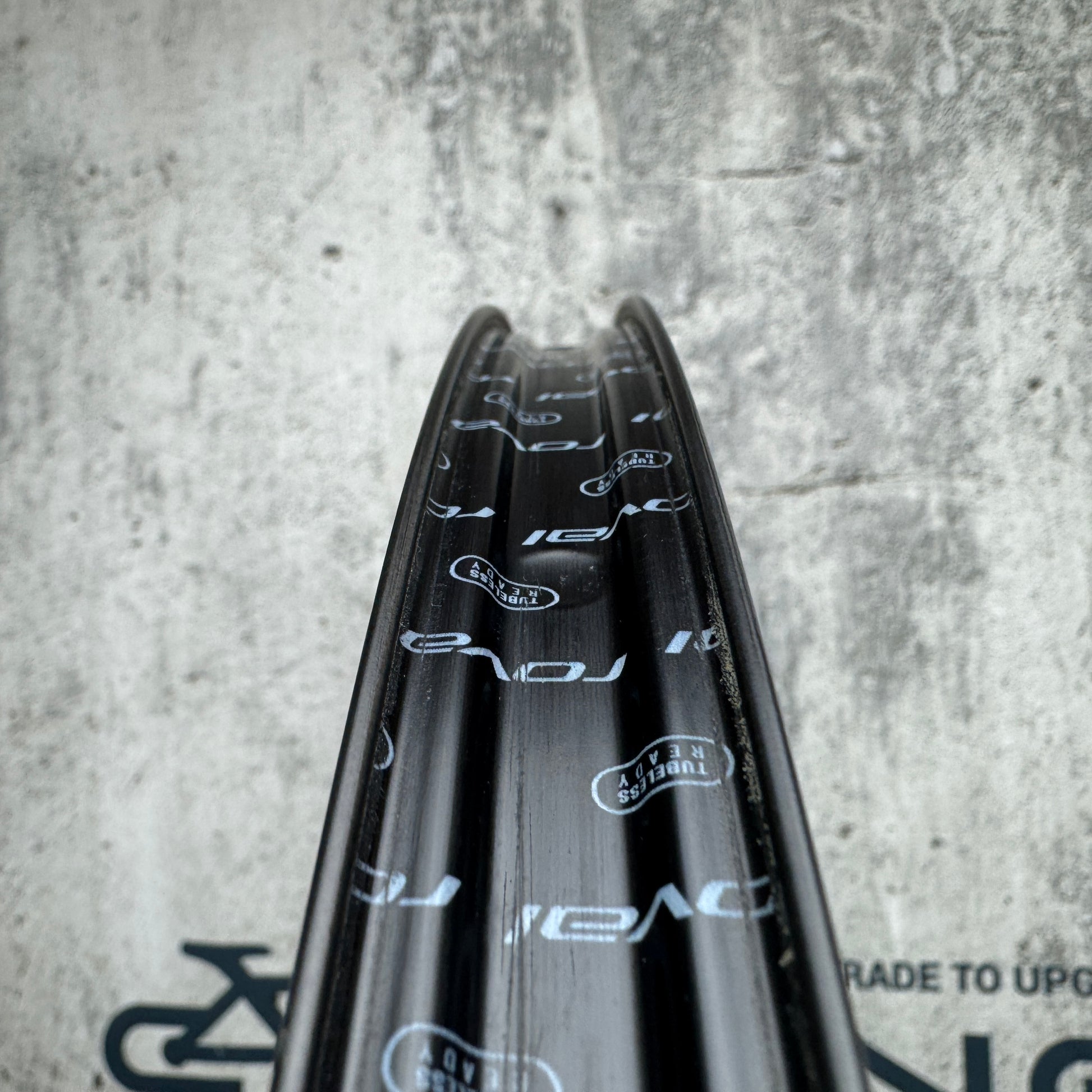 Rims: 33mm deep carbon rims, 26mm external width, 21mm internal width. Tubeless rim tape is present on the wheel, and it is tubeless compatible. May require a new application of tubeless tape to successfully setup tubeless.